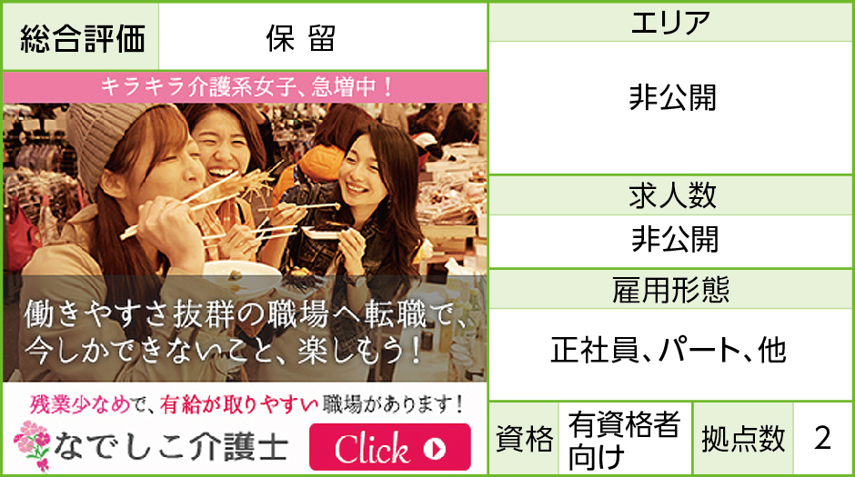 なでしこ介護士 ヘルパーリハビリ職介護職生活相談員看護助手 「女性対象」。情勢が長く働きやすい職場を紹介するサービス。 POINT 専任アドバイザーも女性なので「女性ならではの視点」でサポート。相談しやすい。 「定時で帰れる職場」「突発的な休みを理解してくれる職場」「育児休暇や介 […] 続きを読む