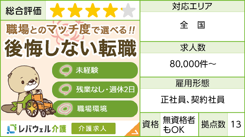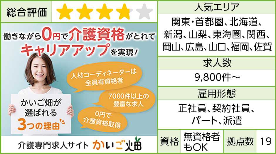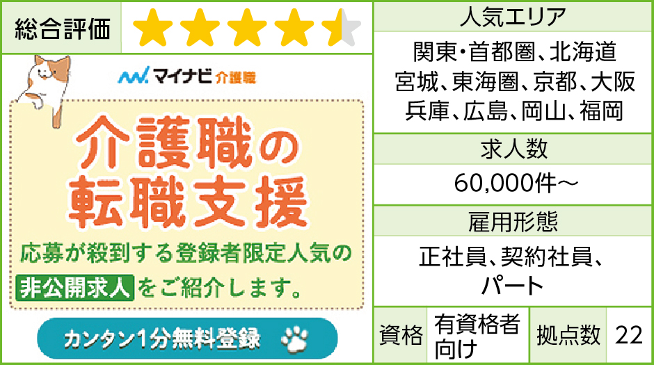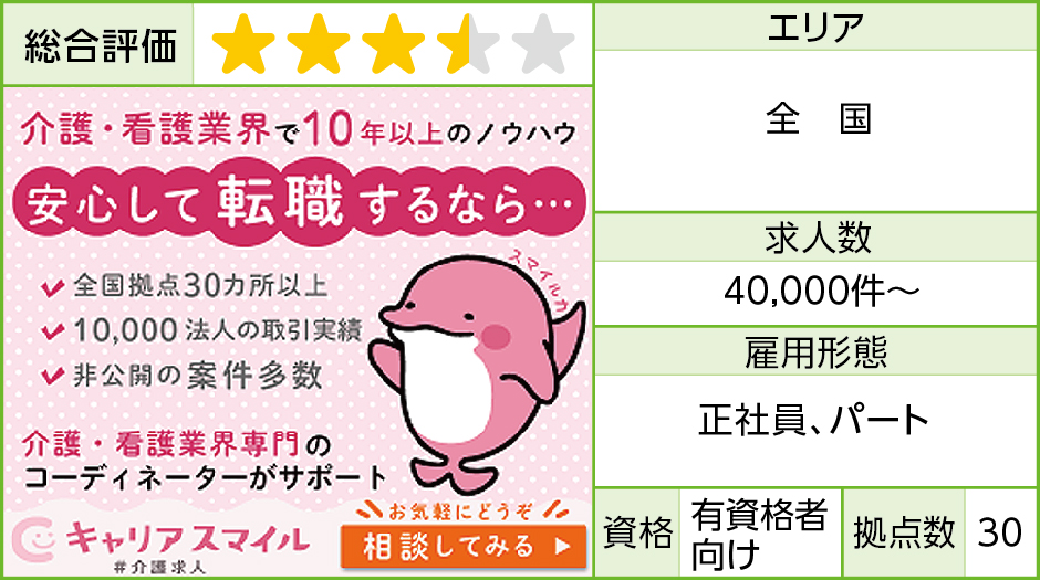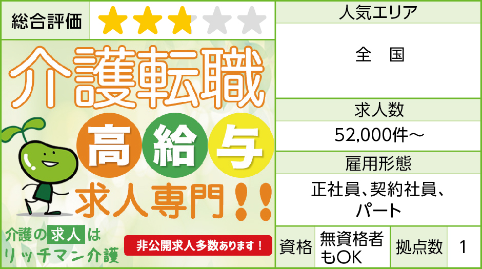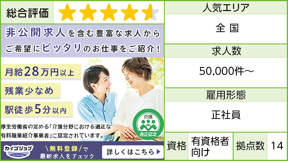 医療・介護の求人数は業界多数。 POINT 非公開求人が多い。 サポート力が強い。 円満退社の為のアドバイスや、ご入職後の継続的なフォローまで、きめ細やかなサポートが自慢。 エリア 求人数 全 国 4,300件以上 職 […]