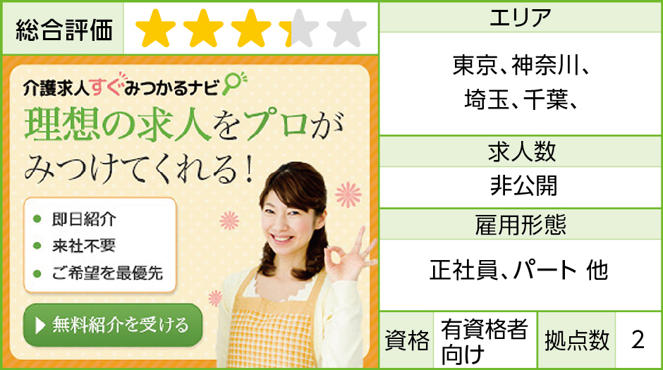医療・介護の求人数は業界多数。 POINT 非公開求人が多い。 サポート力が強い。 円満退社の為のアドバイスや、ご入職後の継続的なフォローまで、きめ細やかなサポートが自慢。 エリア 求人数 全 国 4,300件以上 職 […]